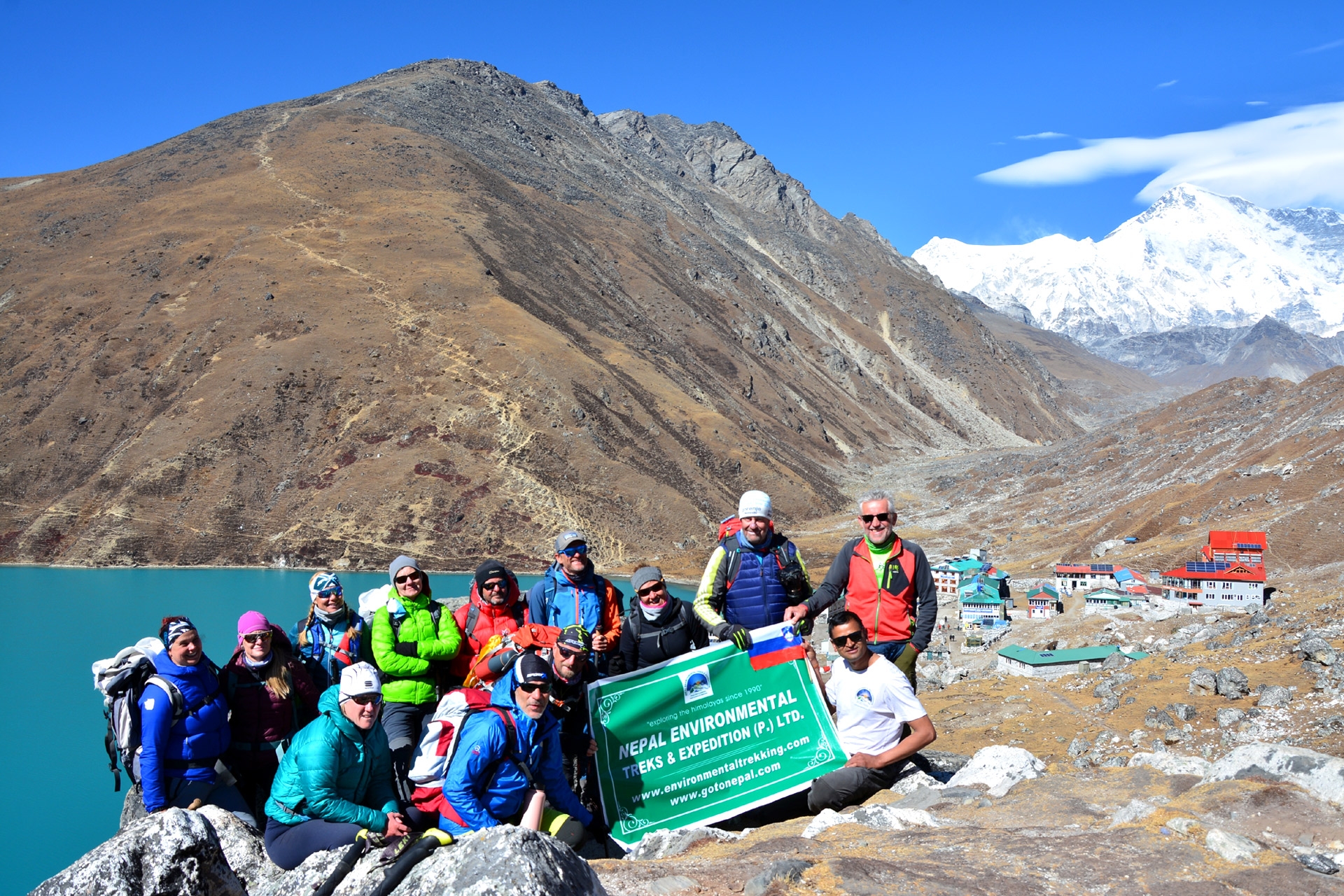 Trek/climb from Gokyo to Gokyo Ri (5483m) and then trek back to Machermo (4150m.) via Gokyo village takes about four and half hours.