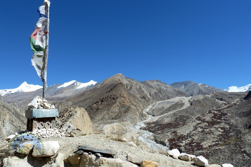 Trek from Manang to Khangsar which takes approximately five hours. The path is gradual descent and you cross a suspension bridge over Jharsing Khola (stream). You trek through dry land though you can see shrubs on the both sides. The panoramic views of Annapurna range completely mesmerize you. Khangsar is a Gurung village. There you find a small monastery, chorten, mani walls and prayer flags.